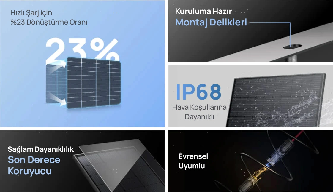 EcoFlow taşınabilir güç istasyonları başta olmak üzere, çok sayıda güneş enerjisi sistemiyle uyumludur.